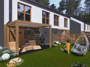 Nowoczesne domy o powierzchni użytkowej 94,4m², zostały zaprojektowane z myślą o wymagających klientach poszukujących przestrzeni i wygody. Każdy dom składa się z trzech pokoi rozlokowanych na drugiej kondygnacji co daje wiele możliwości aranżacyjnych.